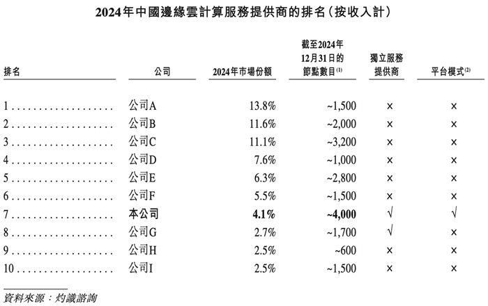 根据灼识咨询的资料,按2024年收入计,PPIO派欧云是中国第七大边缘云计算服务提供商,在中国独立边缘云计算服务商中排名第一,市场份额为4.1%;按计算节点数计,PPIO派欧云运营着中国最大的算力网络。