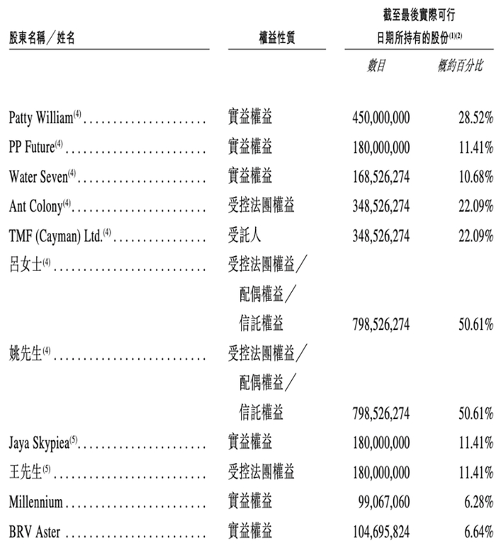 截至最后实际可行日期,姚欣及吕姗姗透过Patty William、PP Future、Water Seven及Ant Colony (统称「境外控股公司」)共同有权行使占PPIO派欧云已发行股本总额约50.61%的股份附带的投票权,被视为一组控股股东。