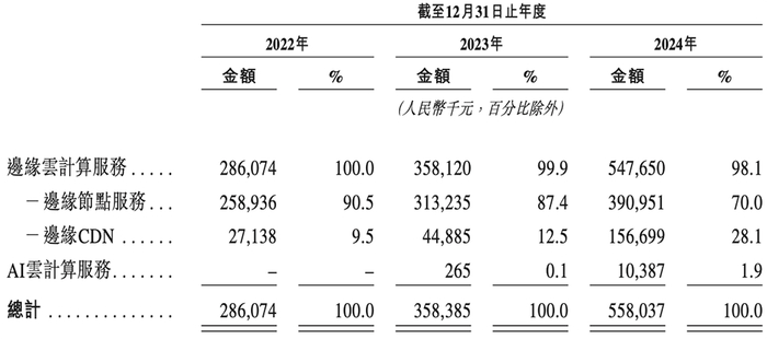 其超过98%的收入来自边缘云计算服务(边缘节点服务、边缘CDN),少部分收入来自2023年首次推出的AI云计算服务(GPU云服务、模型API)。