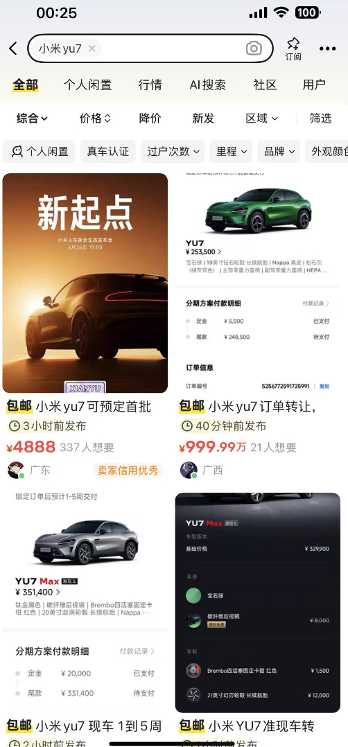 这波热销也迅速波及到二手市场。以闲鱼为例,已有大量小米YU7转让订单挂出,部分为加价转售,这不禁让人想起当年小米手机F码抢购的“黄牛盛况”。虽然这在热销产品中并不罕见,但如果不加以管理,势必会扰乱真实用户的购车体验与情绪。