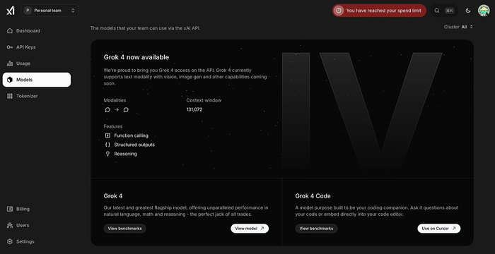 智东西7月3日报道,昨日,据外媒TestingCatalog爆料,马斯克旗下xAI最新Grok 4系列模型的相关信息在xAI开发者中控台网站上泄露。可以看到,即将发布的Grok模型包括旗舰模型Grok 4和编程模型Grok 4 Code。