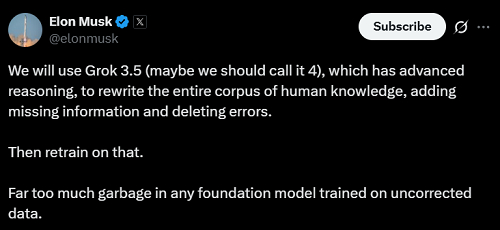 不过,马斯克似乎决定了要在这条道路上越走越远。6月中旬,马斯克在X上发文称,希望用Grok 3.5(现名Grok 4)来重写整个人类的知识库,增加缺失的信息,并删除错误。他认为,任何基于未校正数据训练的基础模型,都会包含大量垃圾信息。