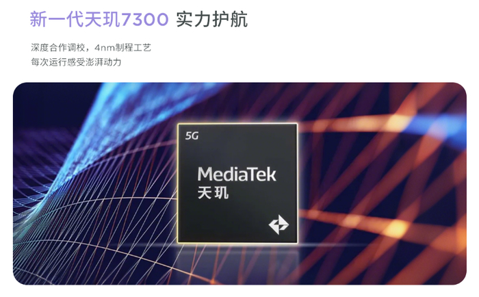 然后安兔兔 75 万分,台积电 4nm 制程工艺,CPU 由 4 个 A78 + 4 个 A55 组成的天玑 7300 ...