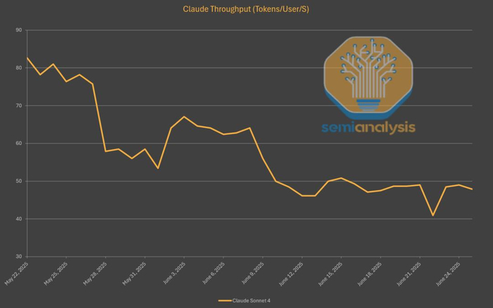 Claude 4 Sonnet发布以来,输出速度已经下降了40%,但仍然比DeepSeek快不少。