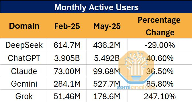 以上数据来自SemiAnalysis发布的一篇报告,详尽解读了DeepSeek对AI模型竞赛的影响以及AI市场份额的现状。