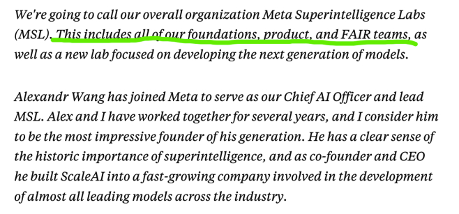在官宣超级智能实验室成立的备忘录里,小扎写道:我们将把整个组织命名为 Meta 超级智能实验室(Meta Superintelligence Labs,简称 MSL),涵盖我们所有的基础研究团队、产品团队、FAIR团队,以及一个专注开发下一代模型的新实验室。