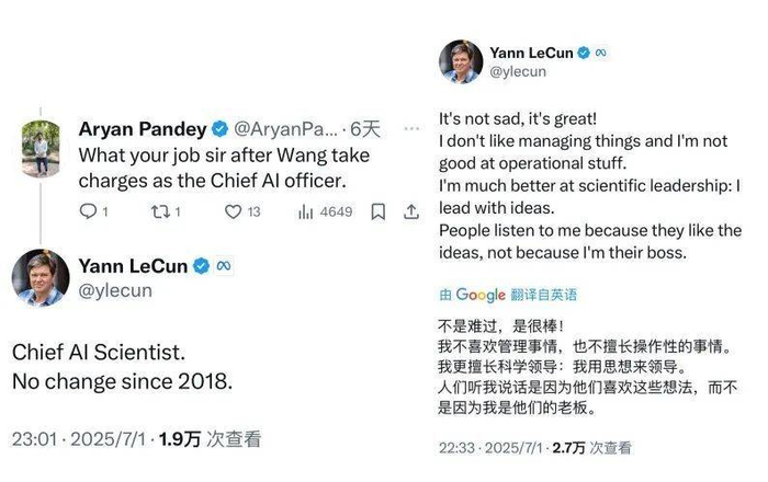 那么问题来了,年仅28岁的Wang是首席人工智能官,而大名鼎鼎的、已经65岁的杨立昆是首席人工智能科学家。难道杨立昆要向Wang汇报吗?