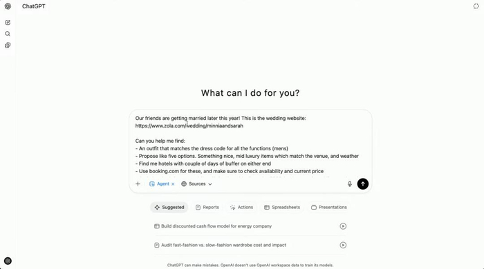 比如,在 OpenAI 的演示里,操作员让 OpenAI Agent 挑一套适合参加婚礼的礼服和礼物。Agent 先用文本浏览器打开用户给的网页信息确认婚礼的日期、天气、位置,然后用可视化浏览器展示可选的礼服效果,之后再继续搜索礼物……