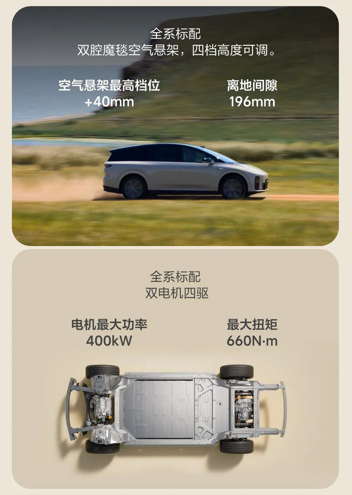 此外,理想 i8 全系标配双腔空悬,具备四档高度可调,离地间隙 20 厘米,有轿车的操控性,上下车也方便。