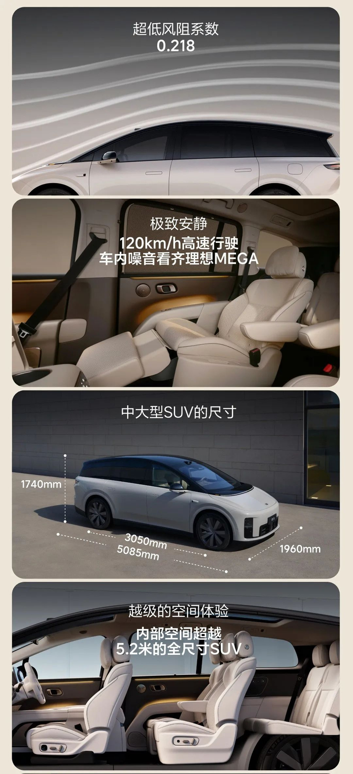 理想 i8,车身长宽高 5085 / 1960 / 1740mm ,轴距 3050mm,定位中大型 SUV 。