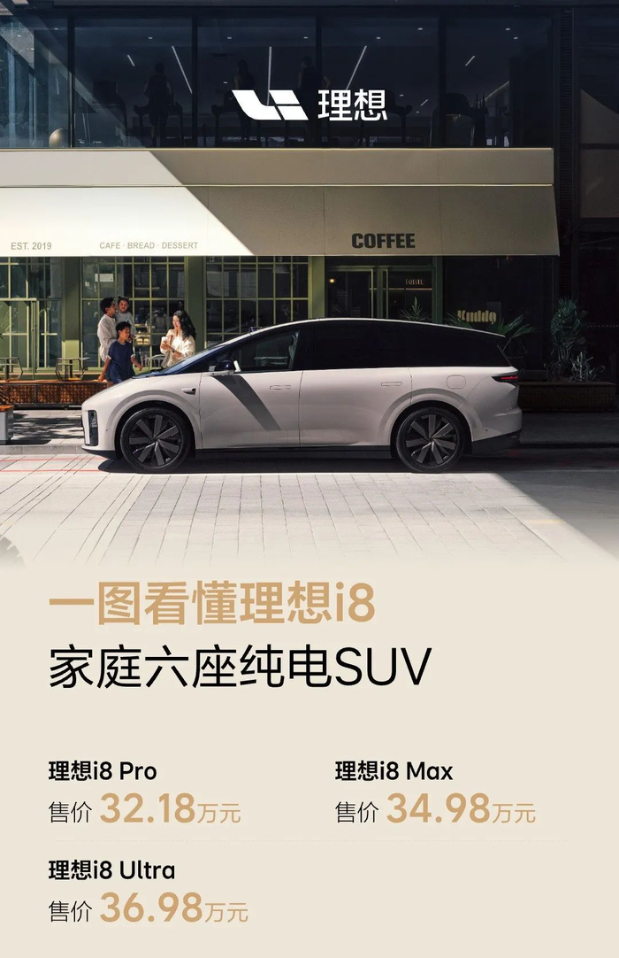这次理想 i8 共推出 Pro、Max、Ultra 三款车型,价格: