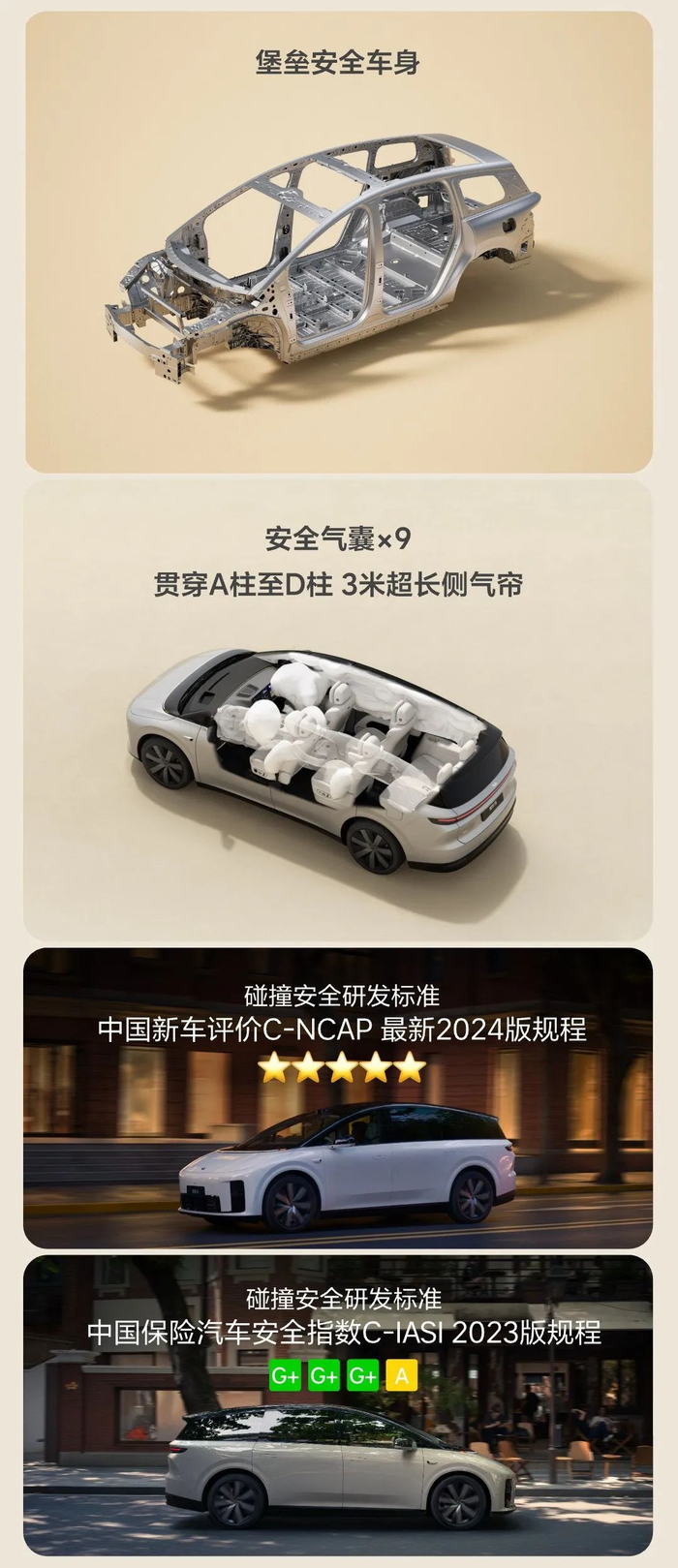 具体配置包括:全车标配 9 个安全气囊,拥有 SUV 车型中最长的侧气帘。门把手、后排屏等 28 处电动开闭件具备防夹功能等等。