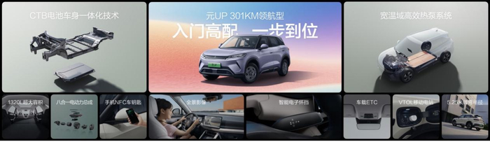 7 月 30 日,元 UP 正式加推 301KM 领航型,售价 7.48 万元。并同步上新了两款车色,以持续进化的产品力,为全球年轻人打造活力出行新选择。