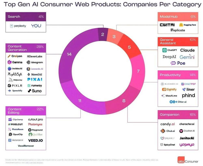 2024年,a16z在当年3月发布的报告指出,AI陪伴已成为主流,有10家产品入选“全球最火的50个AI应用”榜单,如Poly.AI、Crusho.AI、Janitor.AI、candy.ai、SpicyChat.AI、DreamGF.AI、Chub.ai等。