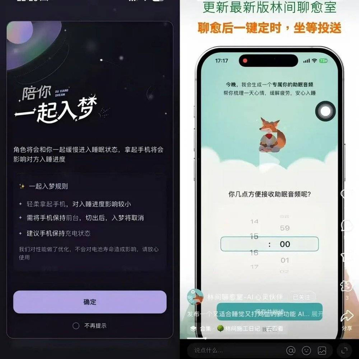 3、虚实结合。实现真人社交和AI社交的融合,如“Tolan”就引入了好友机制,用户互加好友后,可以访问对方的星球,尝试让虚拟陪伴成为真实社交关系网络的一环。除此以外,包括“独响”的“一起入梦”功能、“林间疗愈室”的“早晚安助眠音频”,这些小功能的创新都是为了实现用户的长期留存。