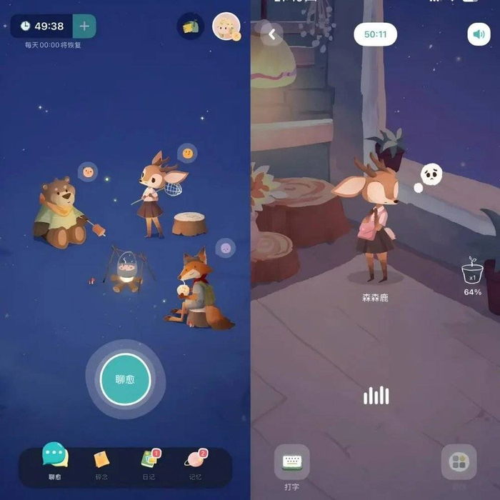 这些产品的典型特征是大多具备1~2个差异化特点,能吸引用户“留”下来。比如“LoveyDovey”涵盖了包括二次元、KPOP等丰富的角色IP库,抓住追星人群的心理特点,搭建阶梯式的好感养成机制,能满足她们的陪伴价值。“林间聊愈室”则是以动物的非拟人化形象,以游戏化的方式帮助用户分析情绪。