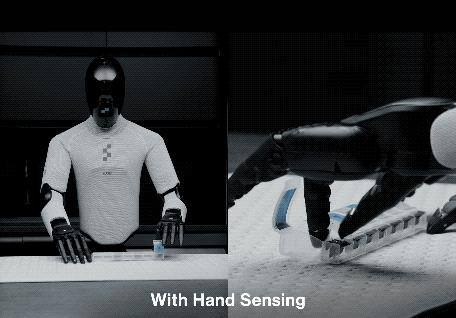 头部的全景摄像头、掌心的近距离相机、指尖的触觉传感器,全身的关节运动状态全被喂进神经网络。