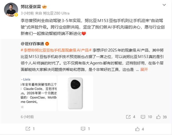 张雷表示,李想曾预判全自动驾驶3-5年实现,努比亚M153豆包手机则让手机迎来自动驾驶式体验升级。”