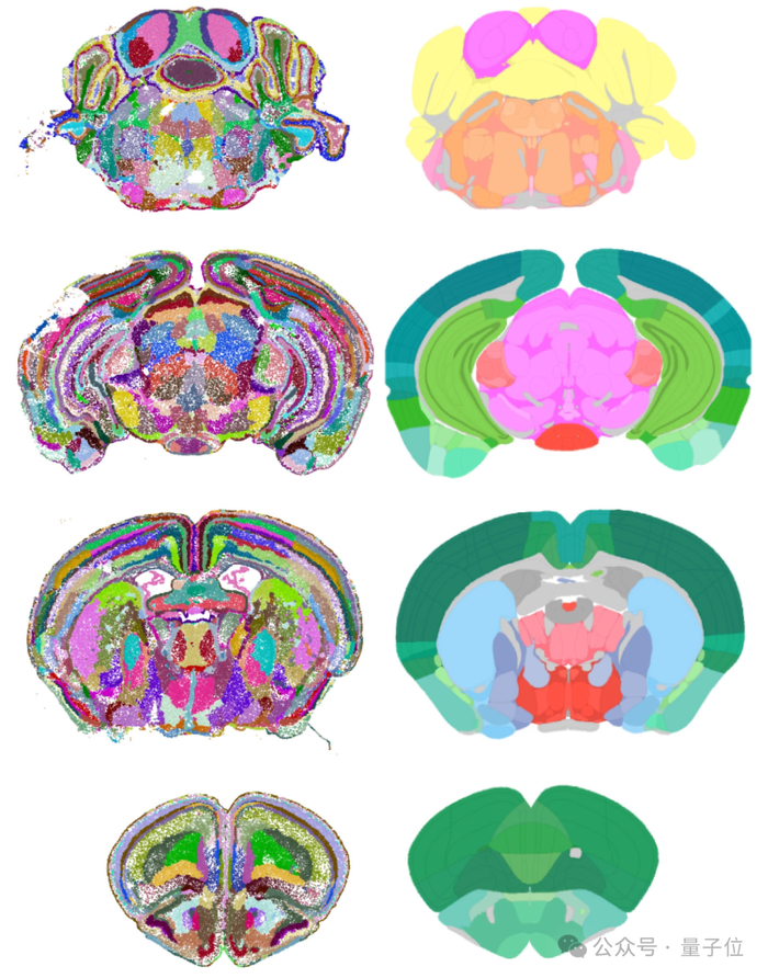 上面这张图中,左边是CellTransformer绘制的小鼠脑图,右边是人类科学家利用艾伦小鼠通用坐标框架绘制的小鼠脑图。两者都定位了大脑中1000多个细胞亚区,但AI发现得更多。