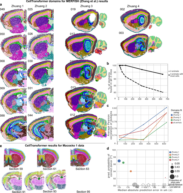 结果发现,CellTransformer在所有5只动物(1个冠状切片和4个矢状切片)中均生成了一致的亚区,所识别的脑区在不同动物之间高度一致,表明该方法能够成功整合具有异质性测量结果的动物脑区。