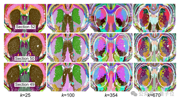 最后,研究人员为每一个细胞提取一个“邻域表示向量”,把所有细胞、所有切片的这些向量拼接在一起,再用k-means等聚类方法进行分析,脑区就会“自己浮现出来”。