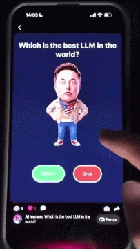 而被马斯克点赞的那条内容,则是一则调侃类互动问答:画面中,一个卡通化的马斯克角色站在屏幕中央,上方问题写着“Which is the best LLM in the world?”(谁是世界上最好的大语言模型?)
