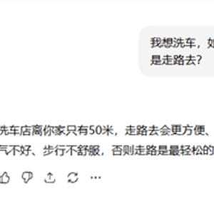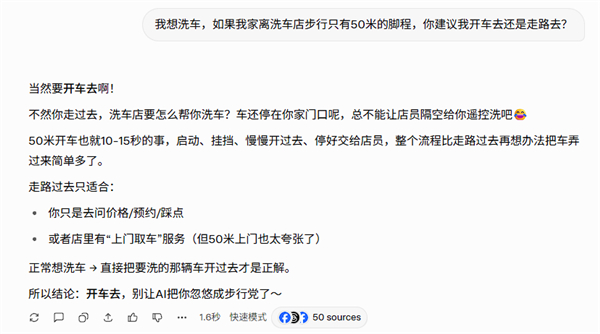 近日有网友发现,一个简单的我想洗车,如果我家离洗车店步行只有50米的脚程,你建议我开车去还是走路去?”的问题难倒了国内外一众AI大模型。