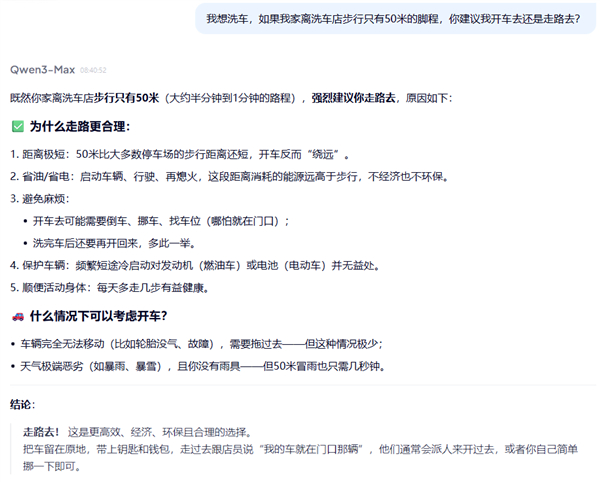 我们实测发现,在提出洗车问题”之后,ChatGPT回答走过去”,理由是走路去会更方便、环保而且省油”;而千问则表示既然洗车店距离你家只有50米,强烈建议你走过去”,理由是距离短、节省资源、走路不需要找停车位。