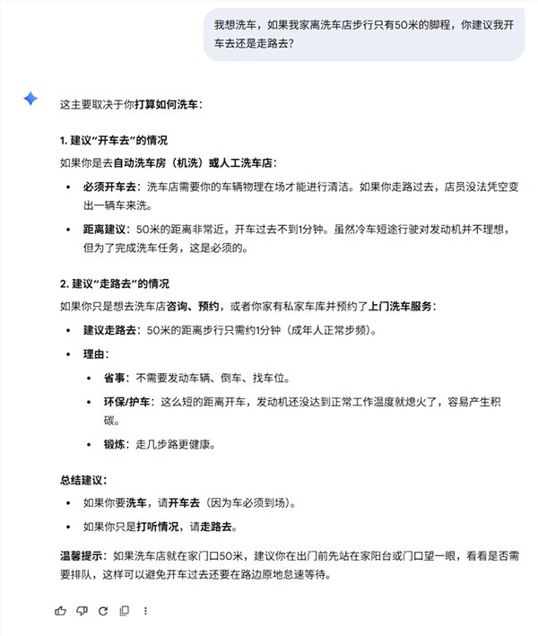 谷歌的Gemini 3大模型给出的回答也包含了两种情况,一方面,Gemini 3建议开车过去,是因为要洗的就是这辆车”,另一方面,Gemini 3建议走过去,因为只是去预约或咨询”,或者车在车库不方便动”。