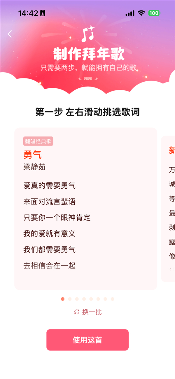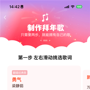 实测发现,AI拜年歌功能支持多款经典曲目翻唱,涵盖《勇气》《青花瓷》《简单爱》《野狼 disco》等不同风格的歌曲,适配多样的拜年场景与个人喜好。