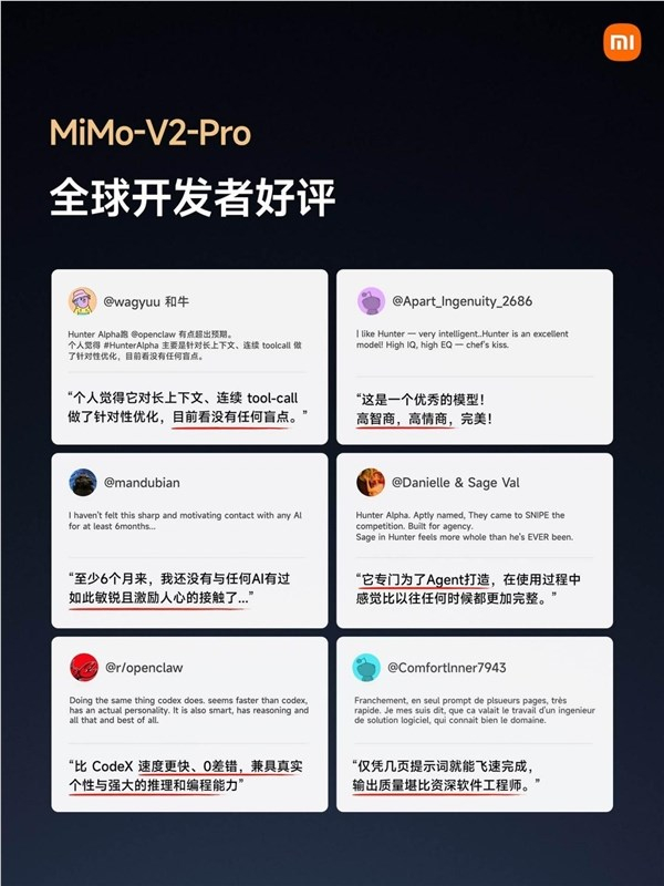 在全球权威AI测评榜单中,MiMo-V2-Pro已位列第一梯队,并获得开发者广泛好评。