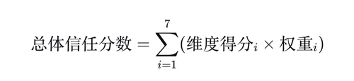每个维度都被评分、归一化,然后汇总为总体信任分数。一个常见的聚合公式为:
