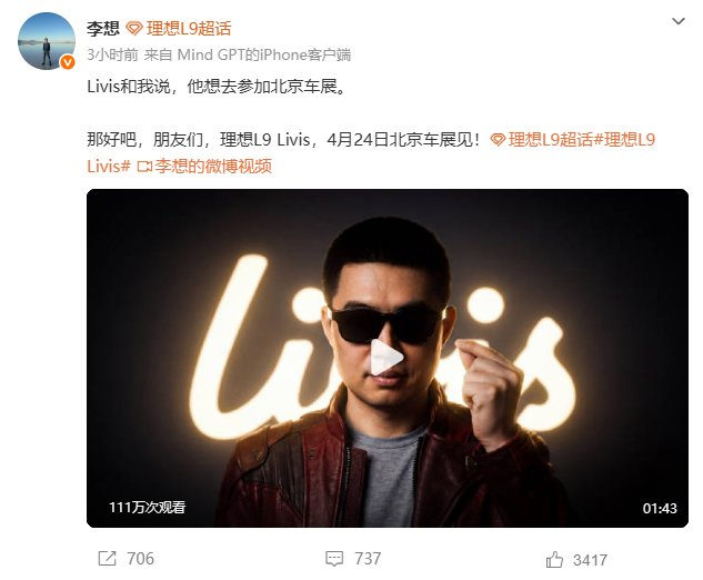 AI李想上热搜 宣布理想L9 Livis将于4月24日亮相