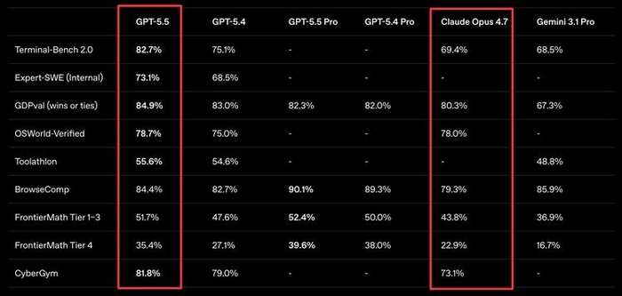 SWE-Bench Pro(编码):GPT-5.5不及Opus4.7。@deedydas指出OpenAI刻意没在发布材料里报这个成绩——"trying really hard to bury the lede."