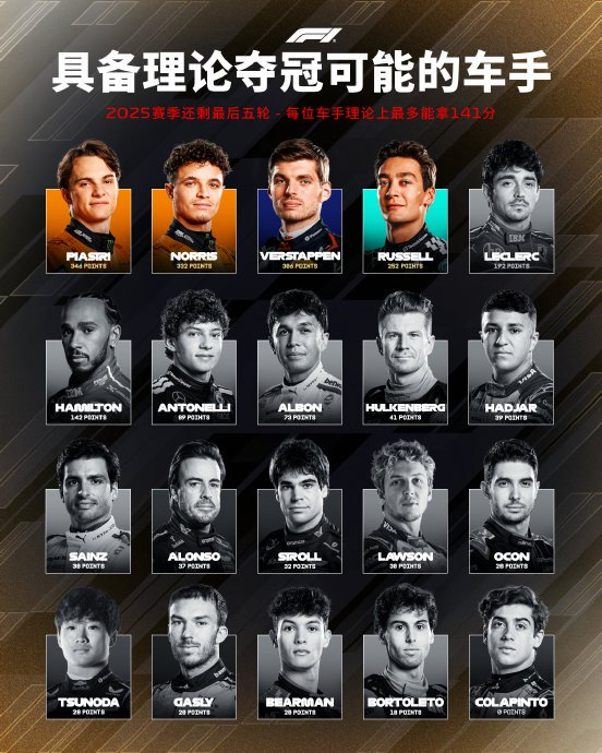 - 诺里斯因现有8亚的压倒性优势,即使同分同冠仍大概率卫冕。