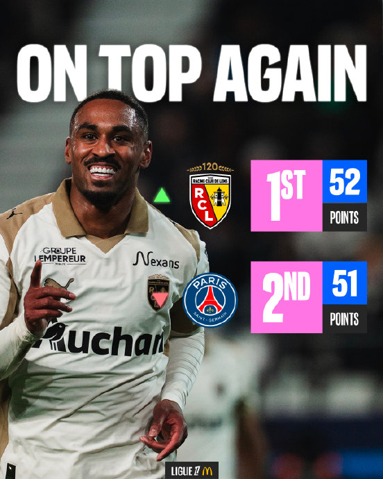 朗斯登顶现状:2026年2月15日,朗斯客场5-0大胜巴黎FC,积分达52分;同日巴黎1-3爆冷负于雷恩,积分51分(少赛1场),朗斯以1分优势时隔21年重返榜首。