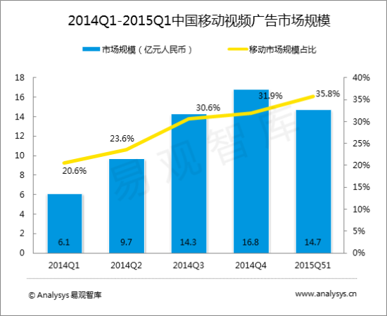 根据Analysys易观智库监测数据显示,2015年第1季度移动端视频市场广告规模达14.7亿元,占据整体视频市场广告规模的35.8%。移动端流量的攀升也使得移动端广告价值逐渐为广告主认可,移动端商业化效果快速显现,占比逐渐增加。