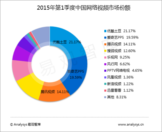 从2015年第1季度中国网络视频市场广告收入的市场份额情况来看,2015年第1季度,优酷土豆、爱奇艺PPS、腾讯视频分列中国网络视频市场广告收入的前三名。聚焦1季度及未来视频市场表现,整体市场在投资运营方面更加理性,逐渐趋向通过内容、商业模式、技术等方面的创新实现内生性增长。