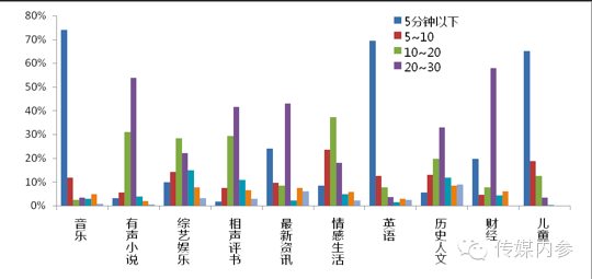 音乐类、英语类、儿童类,以碎片为主,时长都在5分钟以下,但有声书、相声、最新资讯、历史以及财经这些类别上,时长20-30分钟的占优。