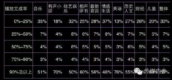 以上这份数据和播放完成率(完播率)有关。与蜻蜓不同,喜马拉雅比较看重这个指标。平台是否会推荐某个电台,这是一个重要依据。完播率差的节目,喜马拉雅一般不会着力推荐。