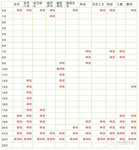 以上这张图表经过一定技术处理。我隐去了具体的数字指标,然后标注了各类别下的收听峰值时段。一个大致的共性是:22点几乎是所有类别的最高峰值时段(新闻资讯在上午10点,儿童类在晚上九点),而23点这个时间段忽然归于相对沉寂,而到了24点,很多类别就又开始热闹了——也许,很多人在23点洗脚洗澡吧。