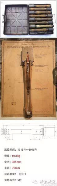 M24型柄式手榴弹弹重610g,战斗部重170g,全长365mm,直径70mm,装药类型TNT,引爆时长5秒。