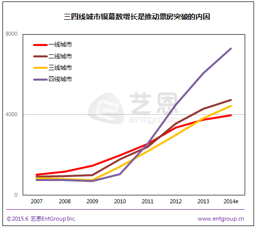 在票房快速增长中,三四线的票房贡献率不断提升,主要原因是影院建设的逐步下沉及对应地区观众观影习惯的日趋成熟。之前对银幕数增长分布作出的趋势分析也可以明确的发现下沉现象的明显。