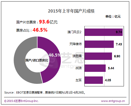 由于出现3部超10亿影片助力,2015年上半年进口片表现出色,在200亿票房蛋糕中分得了107.8亿,进口片/国产片票房占比为53.5%/46.5%,在上半年的“对擂”中以略微优势赢得胜利。在春节档《澳门风云2》及《狼图腾》《战狼》等国产片的提振下,上半年国产片吸金力较去年同期涨幅达43.17%,势头强劲。同时《侏罗纪世界》(12.73亿)以略微优势超越《人再囧途之泰囧》(12.68亿)的成绩,至此,内地历史票房TOP5榜单全部由进口片“霸占”。