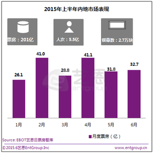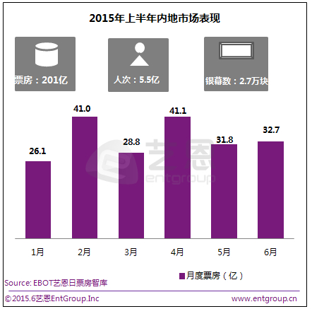 截止6月29日,内地电影市场累计票房报收201.4亿,突破200亿大关,同比增幅超48%,较于2014年成绩提前了2个多月,观影人次5.54亿人次,冠军影片《速度与激情7》的单片成绩达到了24.26亿,同时出现了其他两部超10亿影片-《复仇者联盟2》(14.64亿)和《侏罗纪世界》(12.6亿),国产片冠军宝座则继续由《澳门风云2》(9.74亿)占据。