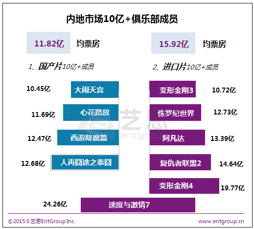 截止目前,内地历史票房中单片超10亿的影片共有10部,其中进口片占据6部,单片均票房为15.92亿也远超于国产片单片均票房11.82亿的成绩。其中2014、2015年的新片入榜高达6席,榜单更新换代速度不断加快。