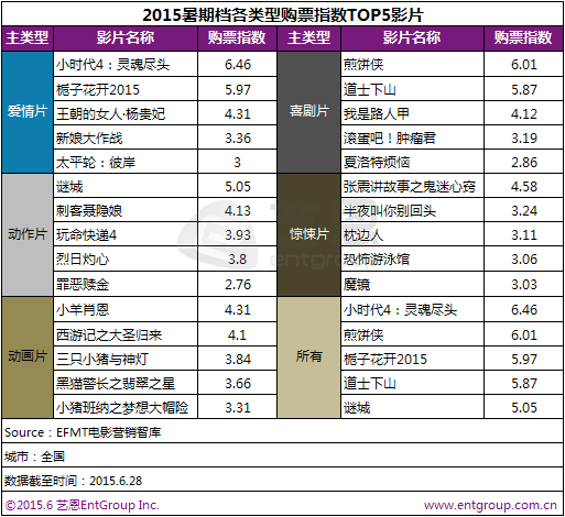 根据EFMT电影营销智库显示,在购票指数上《小时代4》高居榜首,大鹏首部大电影作品《煎饼侠》位列第二,何炅首执导筒的爱情片《栀子花开2015》则位居第三,《道士下山》名列第四,爱情和喜剧更受欢迎,但是要引爆观影热潮,将单片成绩推进10亿线仍具有一定难度,因此暑期档想再刷纪录,可谓困难重重。