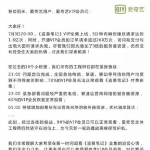 7月3日晚8点,《盗墓笔记》在爱奇艺全集上线,由于必须是“爱奇艺VIP会员”才能观看全集,这掀起了“充值付费潮”。然而,瞬间涌入的流量,让爱奇艺服务器宕机了!最多时有超过70%的VIP会员无法观看《盗墓》。