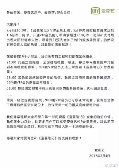 在爱奇艺的致歉信中,小娱特别注意到两个数据,《盗墓笔记》全集上线5分钟内播放请求达1.6亿次,VIP开通请求达到上百万次。相比之下,爱奇艺羊年春晚直播总播放量是7000多万,最高同时在线人数超过1400万人。
