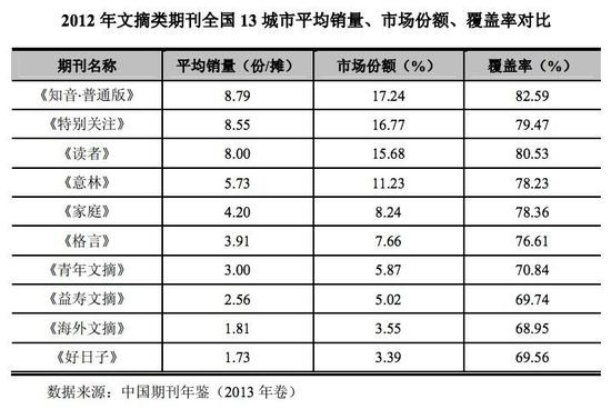 根据中国期刊年鉴公布的文摘类期刊统计数据,2012 年《读者》《知音》和《特别关注》三个刊物的平均销量最高,都在 8 份每摊以上。而第 4 名以下的期刊都在 6 份每摊以下,拉开了较大差距。从市场份额上看,《读者》占 15.68%,排名第三。